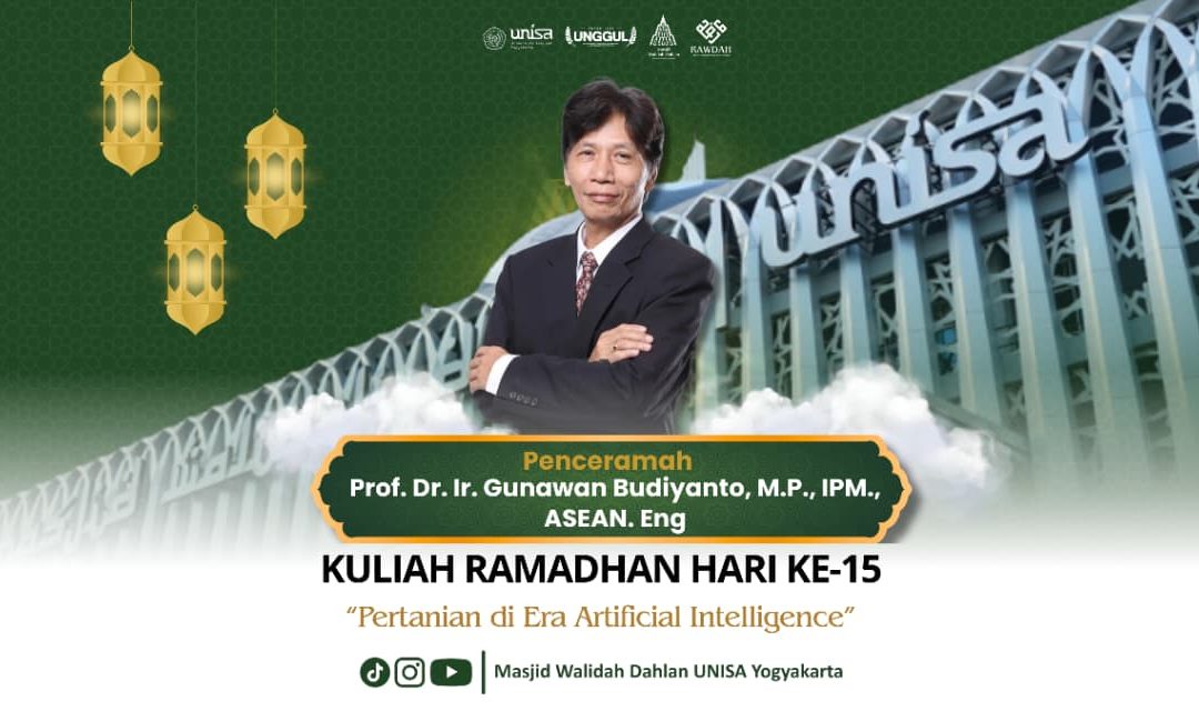YOGYAKARTA, Masjid Walidah Dahlan Unisa- Di tengah pesatnya perkembangan revolusi industri 4.0 dan kecerdasan buatan (Artificial Intelligence), sektor pertanian mulai bertransformasi dari sentuhan tangan manusia menuju ke arah sistem otomatis penuh. Tetapi, di balik efisiensi mesin, terdapat filosofi mendalam tentang asal-usul manusia yang tak boleh terlupakan. Dalam sebuah pemaparan Kuliah Ramadhan di Masjid Walidah Dahlan Unisa pada 03 Maret 2026 bertepatan dengan 14 Ramadhan 1447 Hijriah, Prof. Dr. Ir. Gunawan Budiyanto, M.P., IPM., ASEAN.Eng. yang merupakan Rektor UMY periode 2016-2024, mengajak kita menelaah kembali kaitan erat antara eksistensi manusia, tanah, dan tantangan etika di masa depan pada era Artificial Intelligence (AI).